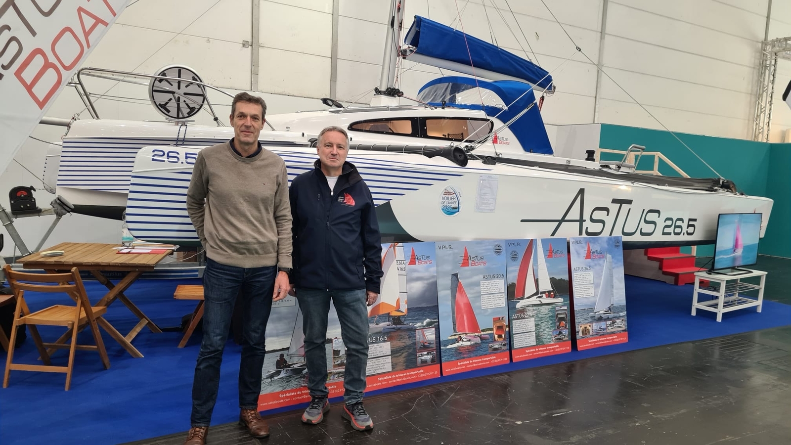 Le stand Astusboats était bien présent avec le 26.5 fraîchement élu Voilier transportable de l'année !Autour de Jean-Hubert, Robert de Thibault et Jean-Marc Le Bihan ont pu représenter Astus Boats Club.