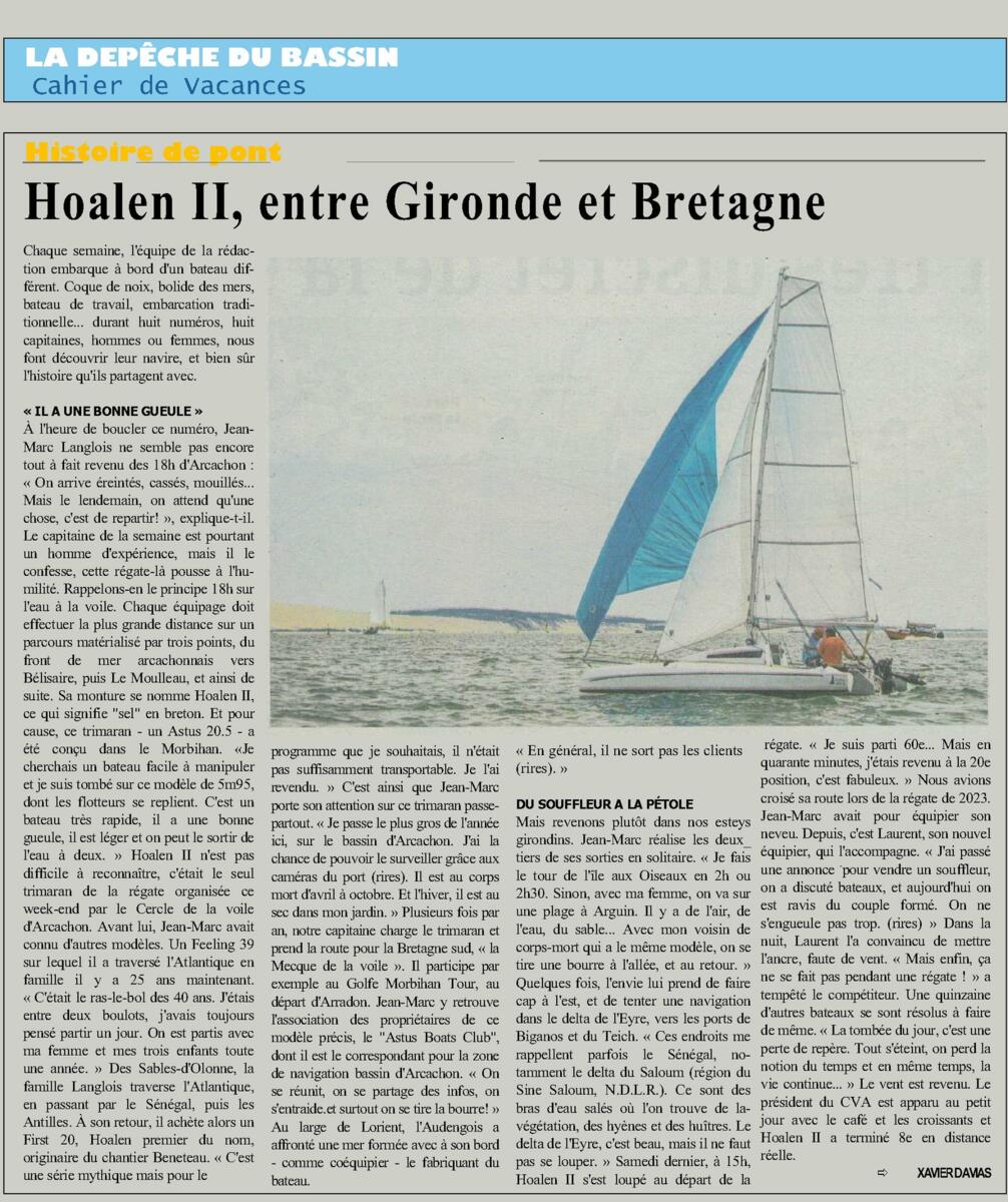 HOALEN II entre Gironde et Bretagne : Chaque semaine, l'équipe de la rédaction de "La Dépêche du Bassin d'Arcachon", embarque à bord d'un bateau différent. Coque de noix, bolide des mers, bateau de travail, embarcation traditionnnelle...durant huit numéros, huit capitaines, hommes ou femmes, nous font découvrir leur navire, et bien sûr l'histoire qu'ils partagent avec.