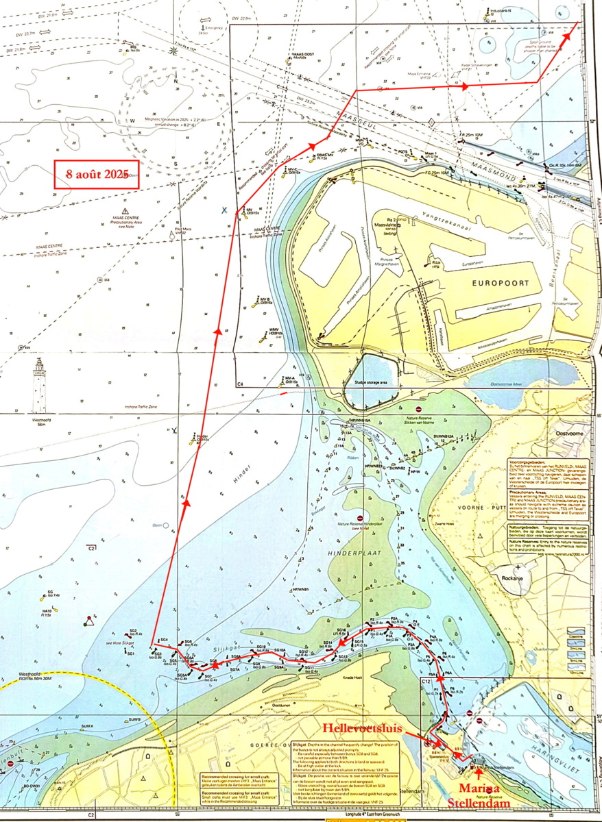 - 12 août : de Scheveningen à Stellendam (22,7 mn). Traversée du rail d'entrée du port de Rotterdam. Passage d'une écluse de mer.