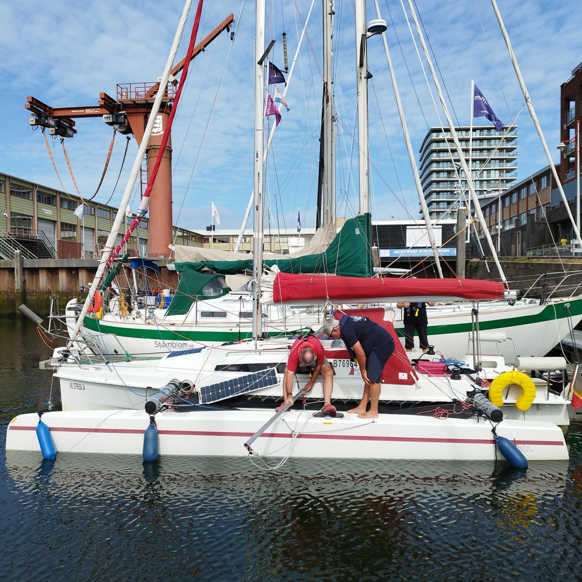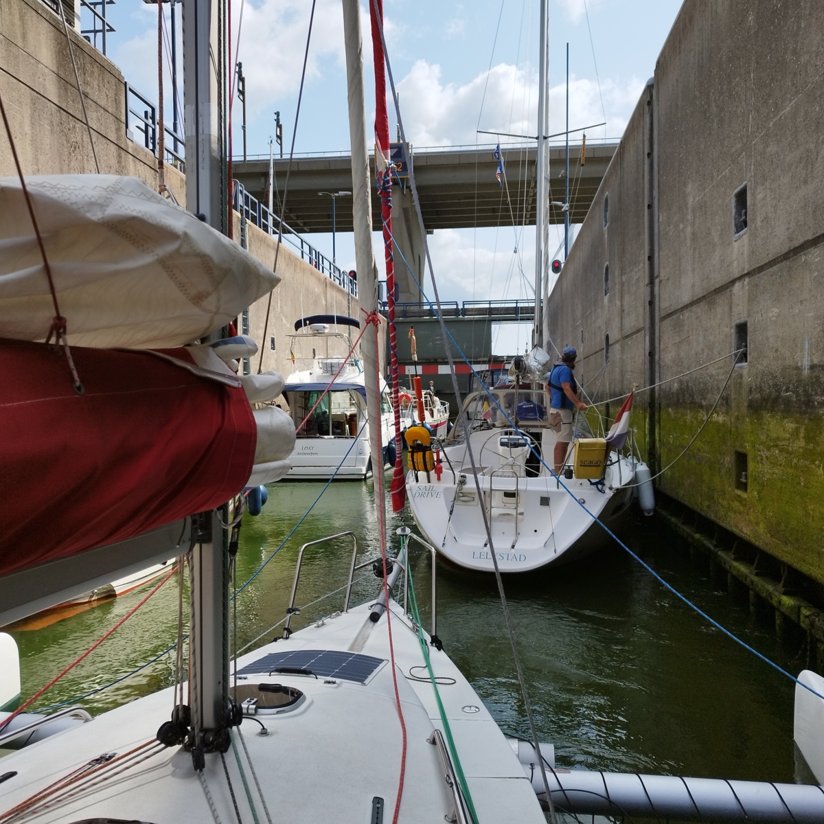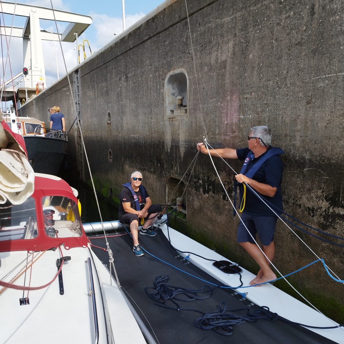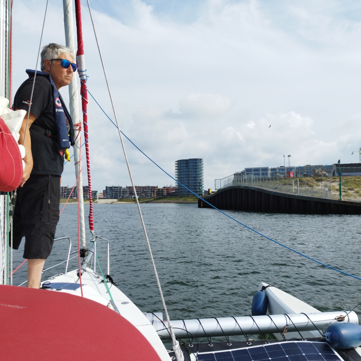 - 8 août : on sort en mer ; navigation de Stellendam jusqu'à Scheveningen (30 mn). Traversée du rail d'entrée du port de Rotterdam. Passage d'une écluse de mer.