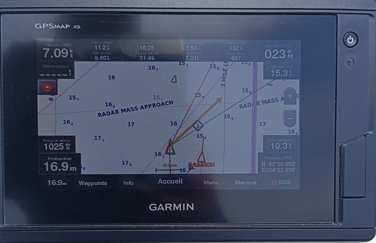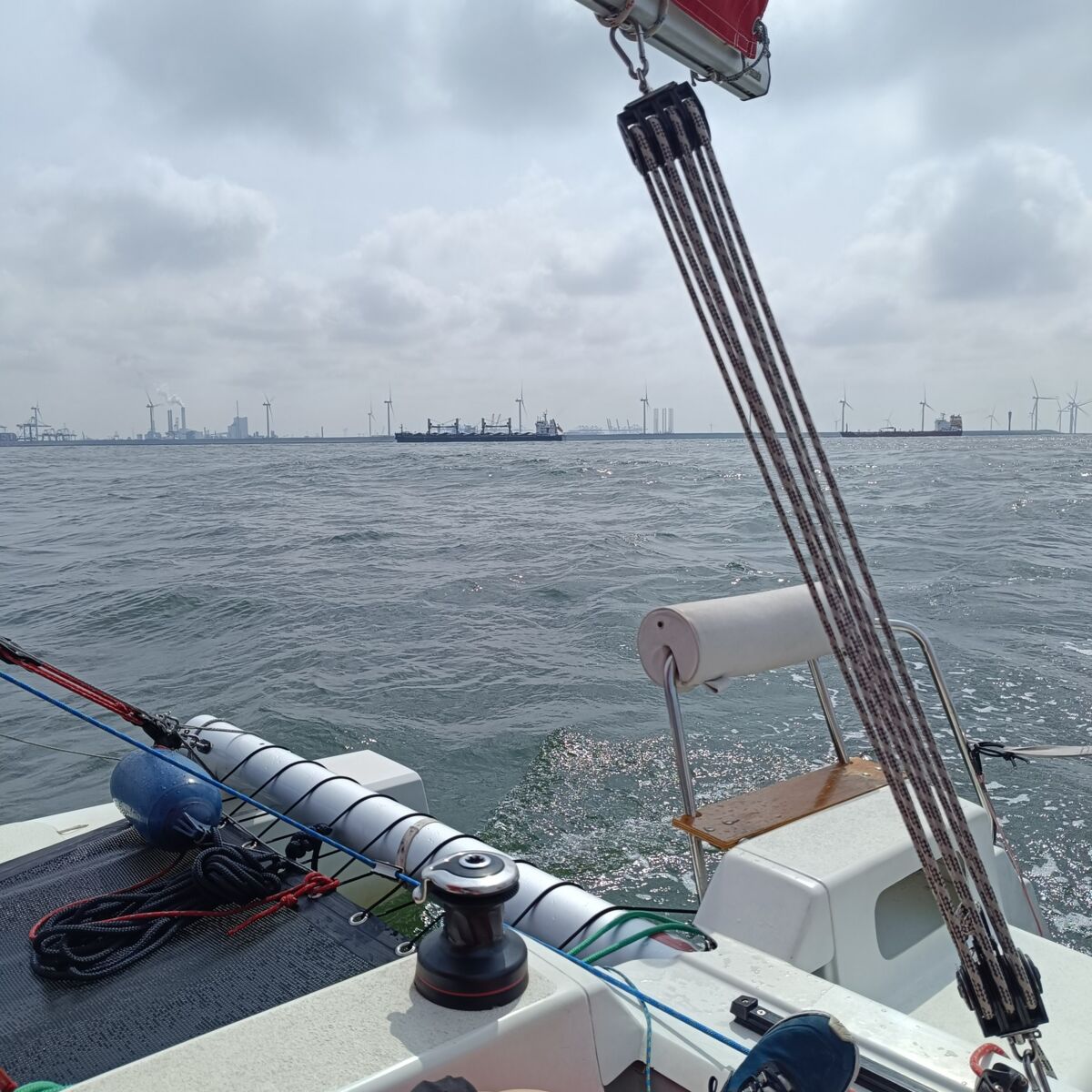 Tout cela avec du beau temps et une bonne ambiance. Un peu de stress pour le passage du rail d'entrée du port de Rotterdam : navigation au moteur obligatoire, contact par VHF pour obtenir l'autorisation du Controle Traffic.Les géants des mers avancent rapidement, plus vite que nous !